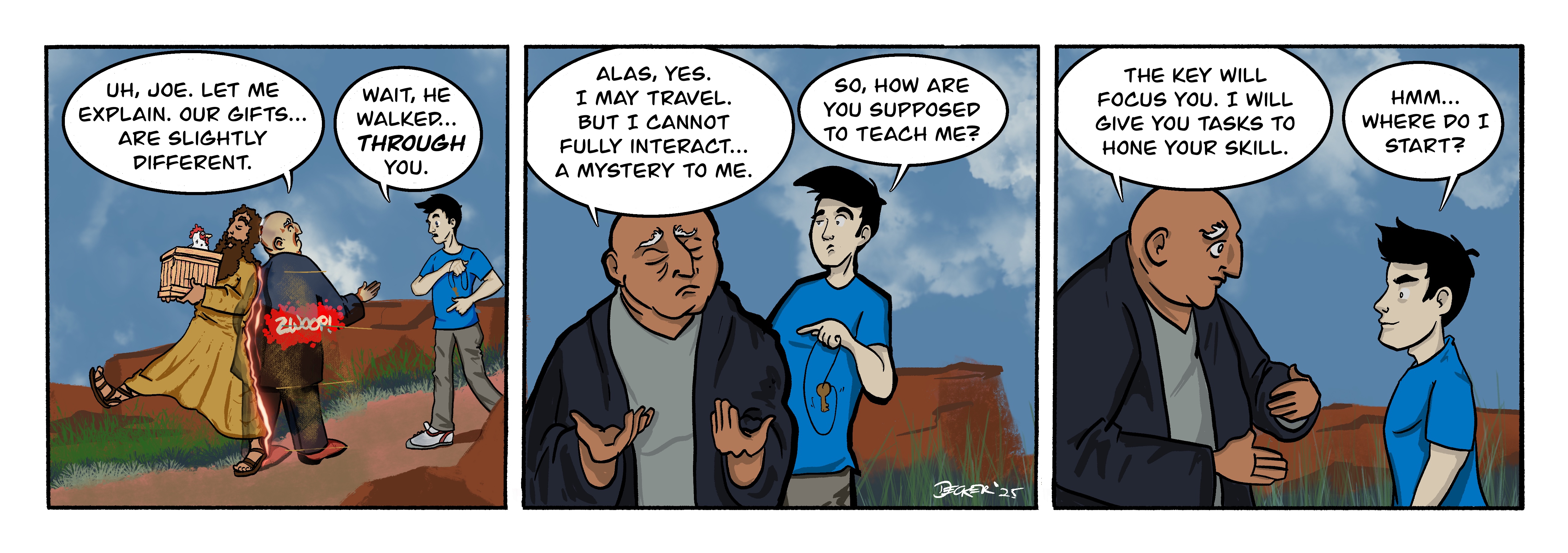 Well, seeing as it’s my birthday, I suppose I should update my comic! Here we get a nice plot-point. Abendroth doesn’t have the ability to touch or interact with things or people when he shifts. My thinking is that he’s working with a twisted version of agility, so it’s a limitation even though it is a spectacle.